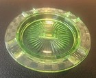 This listing is for a vintage round ashtray Uranium depression glass Green in color Has a geometric/checkerboard design around the edge Opening for cigars/cigarettes Place for a book of matches Measures approximately 5 5/8" in diameter Very good vintage condition Please see photos for details Thank you for looking - so appreciated
