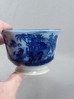 Antique mid 19th century British earthenware tea bowl and saucer. Decorated in the Chen-Si pattern in flow blue transfer. The saucer is marked on the bottom Chen-Si IM.