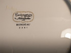 An embossed, scalloped rim. antique oval porcelain serving dish/platter featuring.