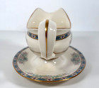 Item Type : Gravy boat (sauce boat) with separate matching underplate (2-piece set). 8.5" long x 4" wide x 3.75" high; underplate approx. Trim : 22K gold accents on rims, spout, handle, base & underplate edge.