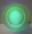 The Westmoreland English Hobnail Uranium Vaseline Green Flared Luncheon Plate is a vintage piece of glassware originating from America in the early 20th century. This unique plate features a round shape with a pointed rim, a high polish finish, and a glowing vintage theme. Made of pressed glass with a Uranium content for a green hue, this one-piece set is perfect for all occasions and should be hand washed for proper care. The Westmoreland brand ensures quality craftsmanship, making this luncheon plate a charming addition to any table setting. It does have some scratches on it - please see last picture.
