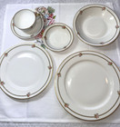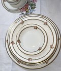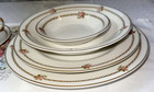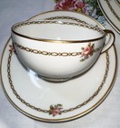 Gorgeous antiqueTheodore Haviland 6 piece place setting inThe Hanoi pattern.The Hanoi pattern (Schleiger 1072 ) was crafted inLimoges, France ca. 1903 - mid 1920's (Mary Frank Gaston, 3rd Ed. MARK 34) of fine porcelain and decorated with a gold chain band and pink roses for a simpleArt Nouveau look.