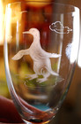 Glass 2 features a circus bear drinking out of what appears to be a liquor bottle with mountains in the background. Glass 1 features a circus bear balancing on a large ball which has a grid pattern on it.