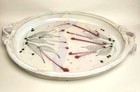 Vintage studio pottery platter with organic leaf motif and drip glaze design. Handmade ceramic tray featuring a beautiful wabi sabi aesthetic with natural variations and earthy tones. Large statement piece measuring approximately 15.25 inches handle to handle. Subtle firing line present from the studio process, does not go through the base and is not structural. No chips or cracks. Perfect for use as a serving tray, centerpiece, or decorative display in organic modern, Japandi, or rustic interiors.