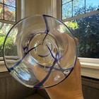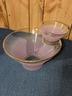 The BLENDO Mid Century FROSTED PURPLE ORCHID CHIP/DIP BOWL with HOLDER is a stylish and vintage chip and dip set made by West Virginia Glass. The set includes a large fuchsia frosted bowl, a smaller clear bowl, and a matching holder. This three-piece set is perfect for serving up chips and dipping sauces in a unique and decorative way. Made in the United States with a beautiful Blendo pattern, this set is a nostalgic and eye-catching addition to any dining table or entertaining space. Sold as is. View photos for dimensions.