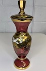 Bohemia Glass Cranberry Pedestal Jar Lid Vase Applied Flowers Gold Enamel