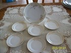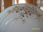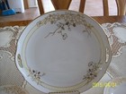 This is Nippon made in Japan. This matching 7 piece set has a stylized floral outline in a high relief gold leaf design accented with a gold leaf line arounf the border and rim of plates. There is very slight wear to the gold leaf along the edge.