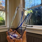 Beautiful Kosta Boda Contrast highball tumblers — mouth-blown crystal-clear glass with a signature cobalt blue swirl threaded through the body of each piece. The glass is bright, the cobalt remains crisp, and each tumbler rings clear.