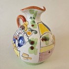 The LaMusa Italy Pottery Pitcher Jug in Desimone Style is a colorful and vintage piece made of ceramic, featuring a round shape with a glossy finish. Handmade in Italy, this pitcher is adorned with a market-themed design and hand-painted details. With a height of 5.5 inches, this mid-century modern piece is a unique addition to any collection of decorative cookware and serveware. Perfect for serving drinks or as a decorative display, this pitcher is sure to add a touch of charm to any home.