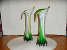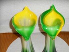 Two Vintage Art Glass 11" Jack in the Pulpit Calla Lily Vases Green Yellow White