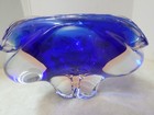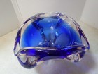 Murano VTG Bowl/Ashtray is a beautifully crafted piece of glass that stands at 8" in diameter and 5 1/4" in height. The rich blue color adds a touch of elegance to any room. Made by the renowned brand Murano, this vintage ashtray is perfect for adding a decorative accent to your space while also serving its functional purpose. Ideal for collectors of decorative pottery and glassware, this unique piece is sure to make a statement in any home. No chips or breaks.