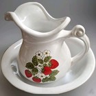 The VTG McCoy Pottery Pitcher & Wash Basin #7515 in the Strawberry Pattern is a vintage set made of stoneware in the United States. The pitcher stands at 7 inches tall and features a glossy white finish with a beautiful strawberry design. This original set by McCoy is a charming addition to any home decor, adding a touch of nostalgia and rustic charm to your kitchen or dining area.
