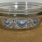 Anchor Hocking Ovenware Covered Casserole Dish with Blue Hearts design. 1.5 Quart capacity and measures 8.25" diameter. Oven and microwave safe. NO stovetop or broiler. Lid is marked # 43 and has 1 tiny chip on handle edge as shown circled in green. Chip is not sharp and is hardly noticeable. Shown circled in red is what looks like an extra drip of glass. Doesn’t affect use and is also not sharp.