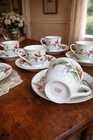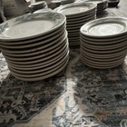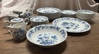 Set: 8 dinner plates 8 salad plates 8 bowls 8 coffee cups 8 saucers Sugar bowl with lid Creamer 9” serving bowl 12” serving platter Crazing present as expected. Most notably on several dinner plates and a couple salad plates that have significant crazing and some darkening of those lines. Sugar bowl has had one handle reattached. Otherwise no chips noted.