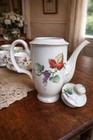 Teapot with lid. Made in Occupied Japan, hand-painted porcelain with floral design. Sugar bowl with lid. Minor wear consistent with age (see photos for details). Perfect for display or use.