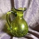 Vintage Blenko green crackle glass small pitcher. The applied handle shows craftsmanship and skill.