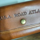 Brand: Bellatoff Item: U.S.A. Road Atlas leather travel case with integrated magnifier. Color: Brown with brass-tone hardware. Materials: Genuine leather exterior with suede interior and clear plastic map protector, plus metal and glass magnifying lens. Front flap is embossed with "U.S.A. ROAD ATLAS" and secures with a snap closure. Interior is debossed "BELLATOFF HANDMADE IN THE USA" with a stitched leather pocket that holds the removable round magnifier. Details: Rolled leather spine, stitched edges, snap fastening, clear protective insert for atlas pages, removable magnifier with leather tab loop. Atlas or maps are not included; listing is for the leather case and magnifier only.