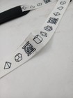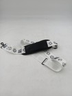 Details: Features black swivel snap hooks at each end to attach to compatible bags and a black slider buckle to adjust the strap length. Pre-owned adjustable strap showing visible wear from use. Multiple gray marks and discoloration spots along the white strap, especially near several printed icons (see photos).