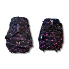 Hidden pullout handle. Style: Rolling duffle‑style travel bag. Color: Navy with pink ribbon accents. Constructed from durable polyester with EVA backing, the bag maintains structure while remaining lightweight.