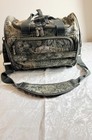 Canvas webbing construction. Has heavy vinyl lining. CONDITION: Pre-owned, very good. Clean inside. Shows normal wear. SHOULDER STRAP DETAILS.