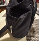 Front zip pocket for easy access to small essentials. Special note: See all photos for details and accurate color representation. Lined black polyester interior with padded laptop/tablet sleeve pocket.