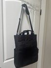 This CALPAK shoulder carry-on or personal item has pockets galore including a shoe chamber, front and inside pockets, a suitcase sleeve, two outer pockets for water bottles etc., as well as elastic pockets. Water resistant poly lets this bag go anywhere. Bag was used once and has tiny light scuffs on corner edge piping as shown in photos.