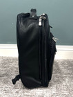 TUMI Alpha Tri-Fold Carry-On Travel Garment Bag - Black with some signs of wear. No rips or tears and all zippers are in working condition. The main handle has wear on the underside stitching. Two end piece of the clips are missing, however it doesn’t have any impact on using the clips. The underside of the straps shows wear. See pictures for the condition and highlighted flaws.